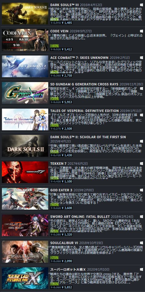 Steamでは現在バンダイナムコエンターテインメント社のタイトルがセール中です!