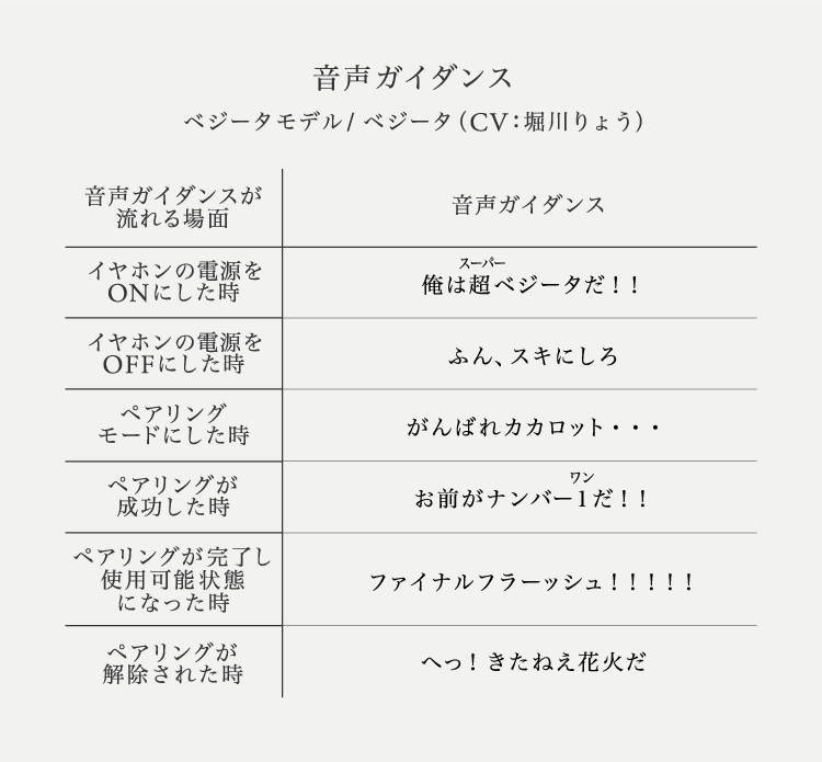 電源ON/OFF等のアナウンスは、孫悟空(CV:野沢雅子)、ベジータ(CV:堀川りょう)の声に。「かめはめ波」や「ファイナルフラッシュ」など、作中でおなじみのセリフがガイド音声に割り当てられています。