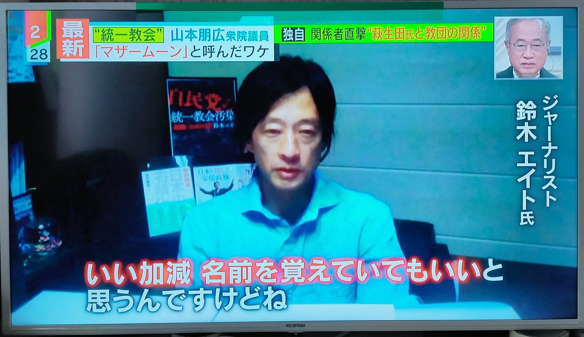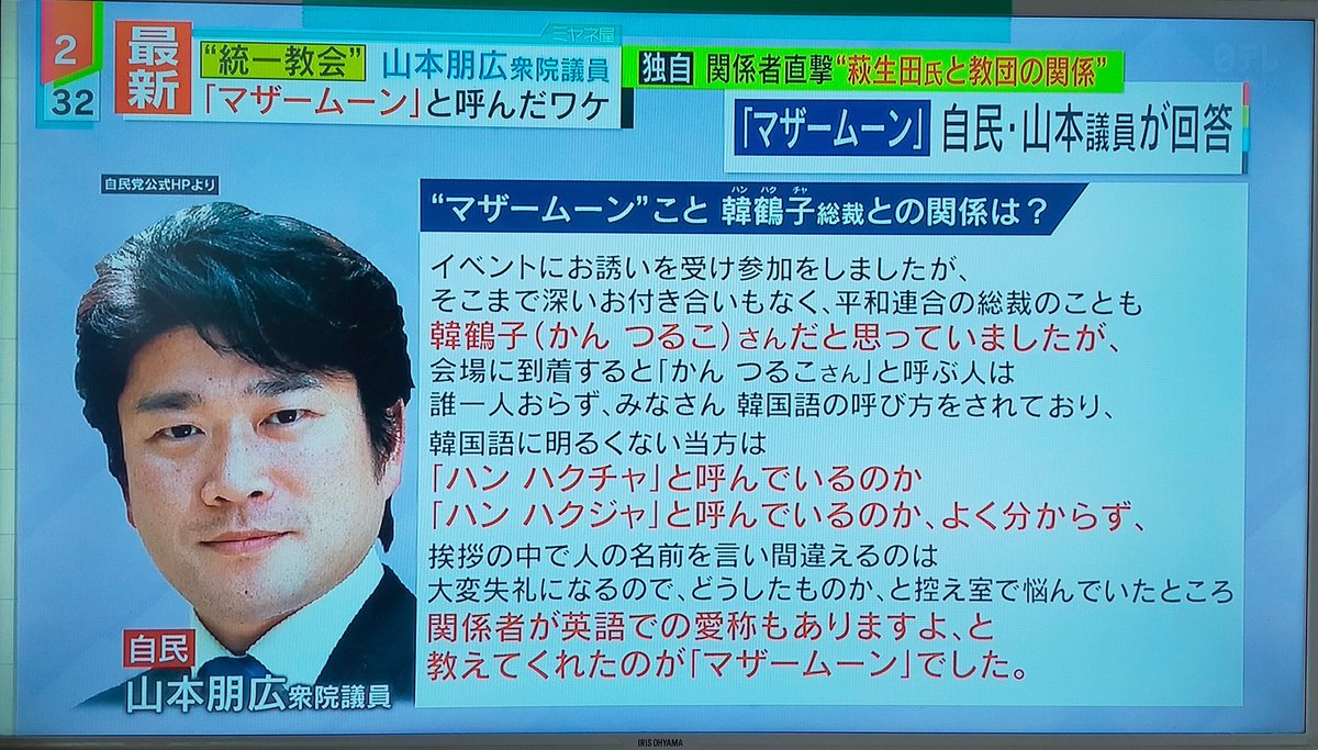 統一教会総裁の韓鶴子を「マザー・ムーン」と呼んだ事について「名前を間違えたら失礼だから」と言い訳していた自民党の山本朋広議員だけど、鈴木エイト氏に「何度も統一教会関連行事に参加してるんだから、いい加減名前を覚えても良いと思うんですけどね」と皮肉られてて笑ってしまう。