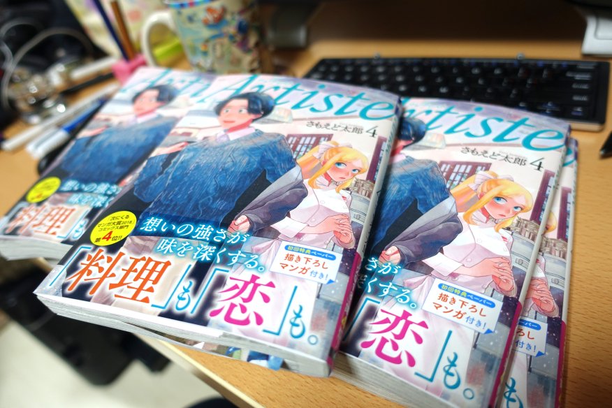 本日Artiste(アルティスト)4巻発売日です、よろしくお願いいたします 初回特典として初版本にのみ4Pのおまけ漫画がついているのでお早めにどうぞ!キャラ単体といつもほぼ隠れる背景です