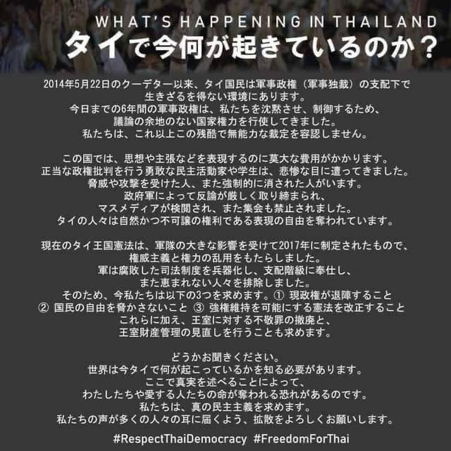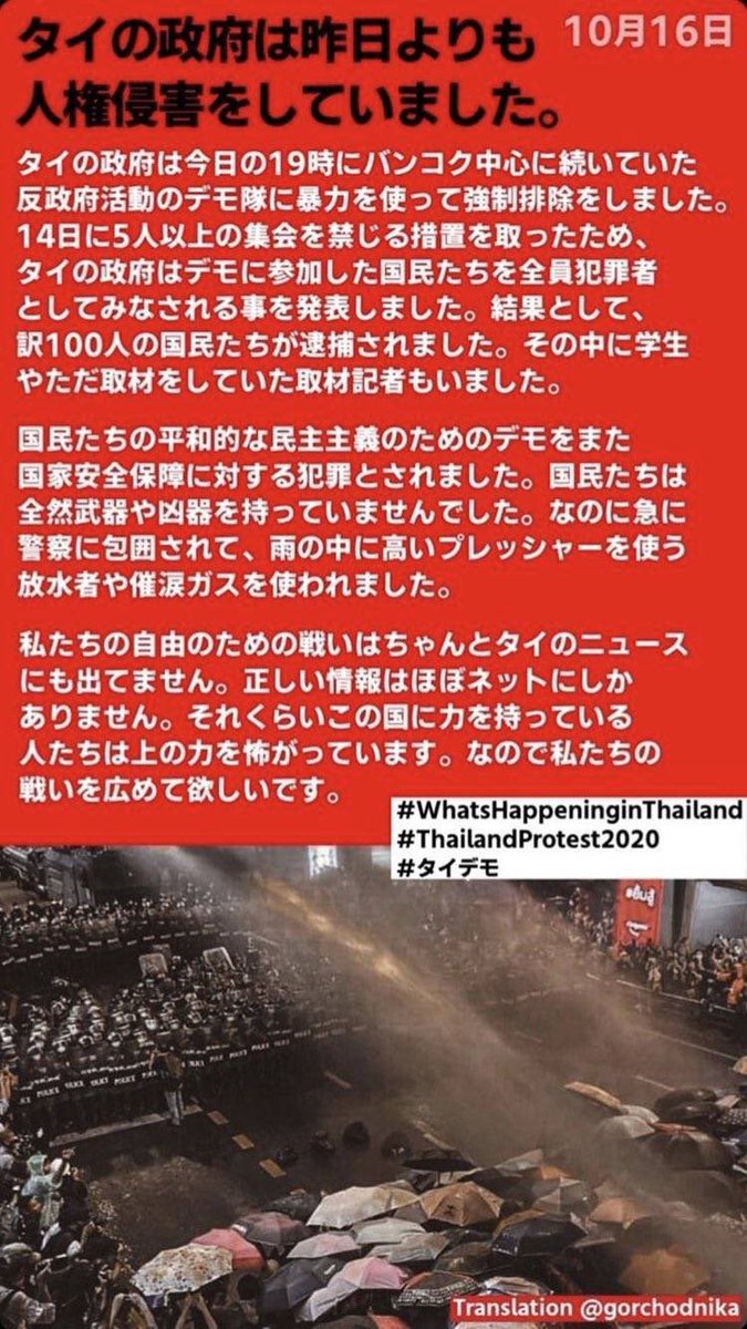 昨日、タイで反政府デモを行いました。デモ参加者が持っているウエポンは傘しかありません。でも、国民は軍事政府に弾圧されました。これは大事な事なので、この事件無視しないでください。お願いしておりました。ありがとうございました。