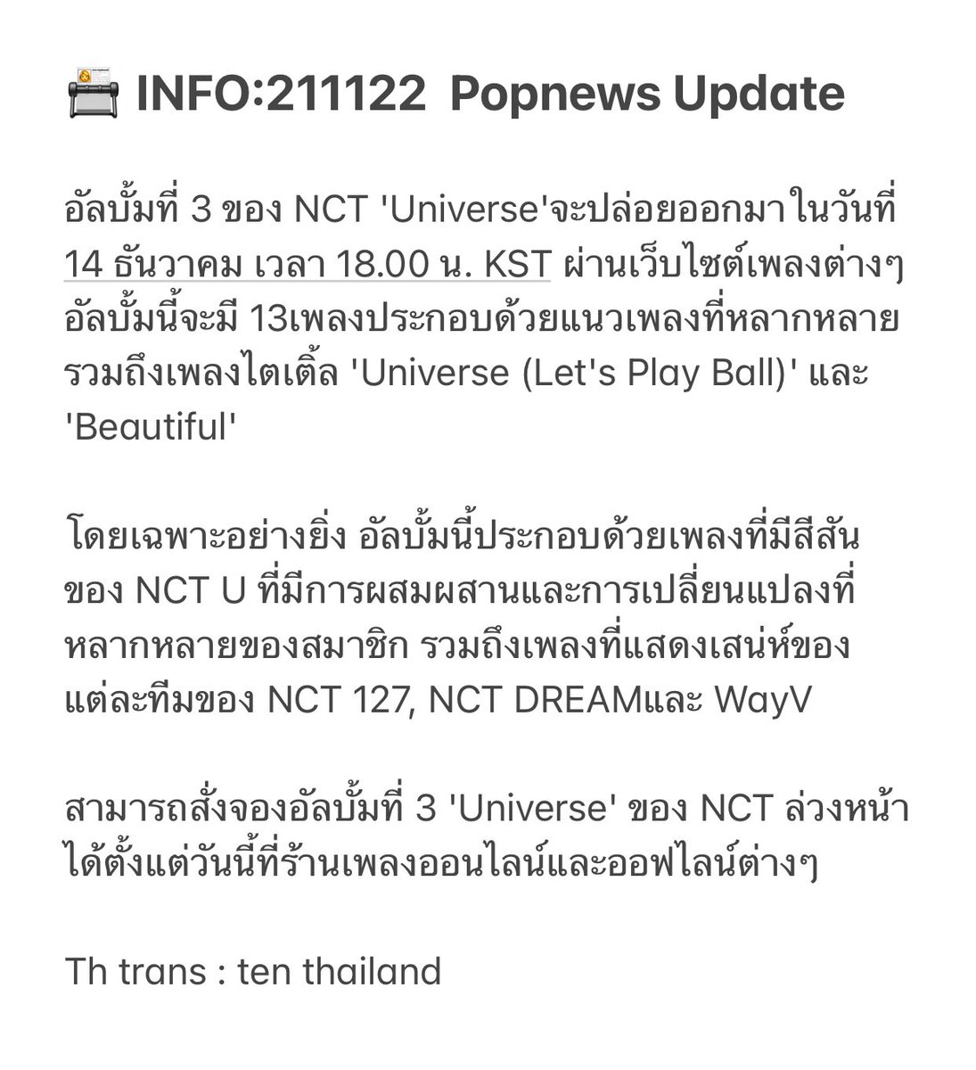 เพื่อเป็นการสนับสนุนเตนล์ใน NCT The 3rd Album ‘Universe’ ทางบ้านจะเปิด Bulk Order และ Donation Support ในนาม “TEN’s THAI FANS“ ในวันที่ 22/11