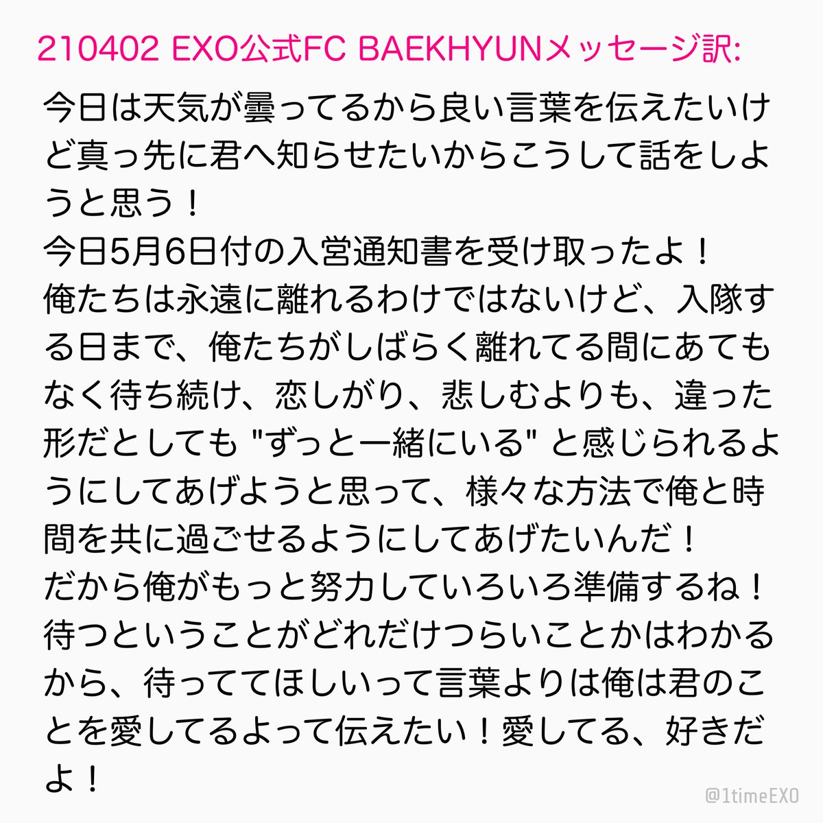🐶沢山のEXO-L達に待たなくてもいいって言ったけど本心は違う。1人も失いたくないしこの時期が過ぎたら良い日々があるだろうに…その日々を共にしたい気持ちは同じだから…とにかく俺は末長く歌い続けるつもりだし末長くステージをやるつもりだから一緒に幸せな思い出を作れたらいいなってのは同じです