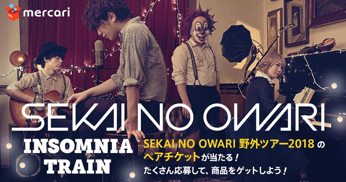 3/6(火)より「メルカリ×SEKAI NO OWARI」のプレゼントキャンペーン第一弾として、SEKAI NO OWARI史上最大規模で展開する、圧巻の大型野外ツアー2018『INSOMNIA TRAIN』のチケットが100組200名様に抽選で当たるプレゼントキャンペーンを実施!