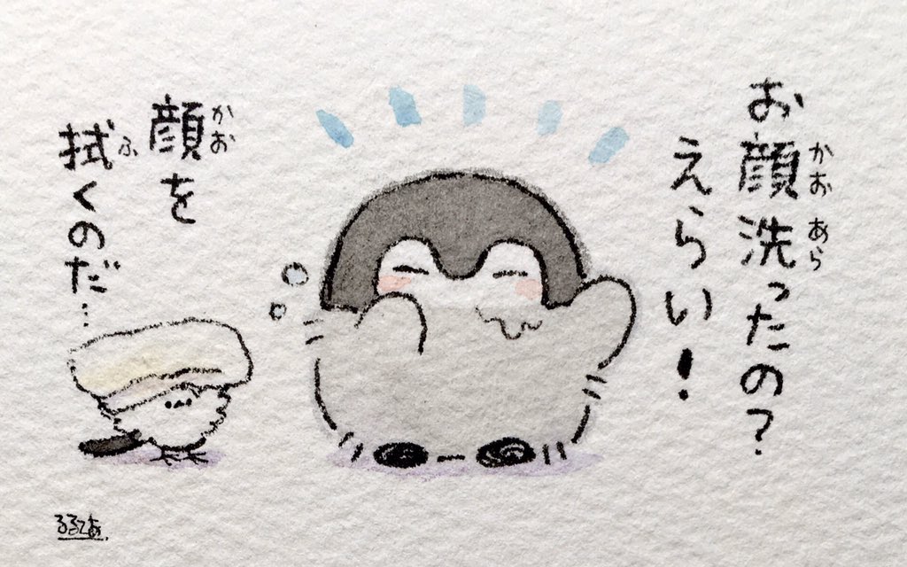 顔を洗う人とコウペンちゃん