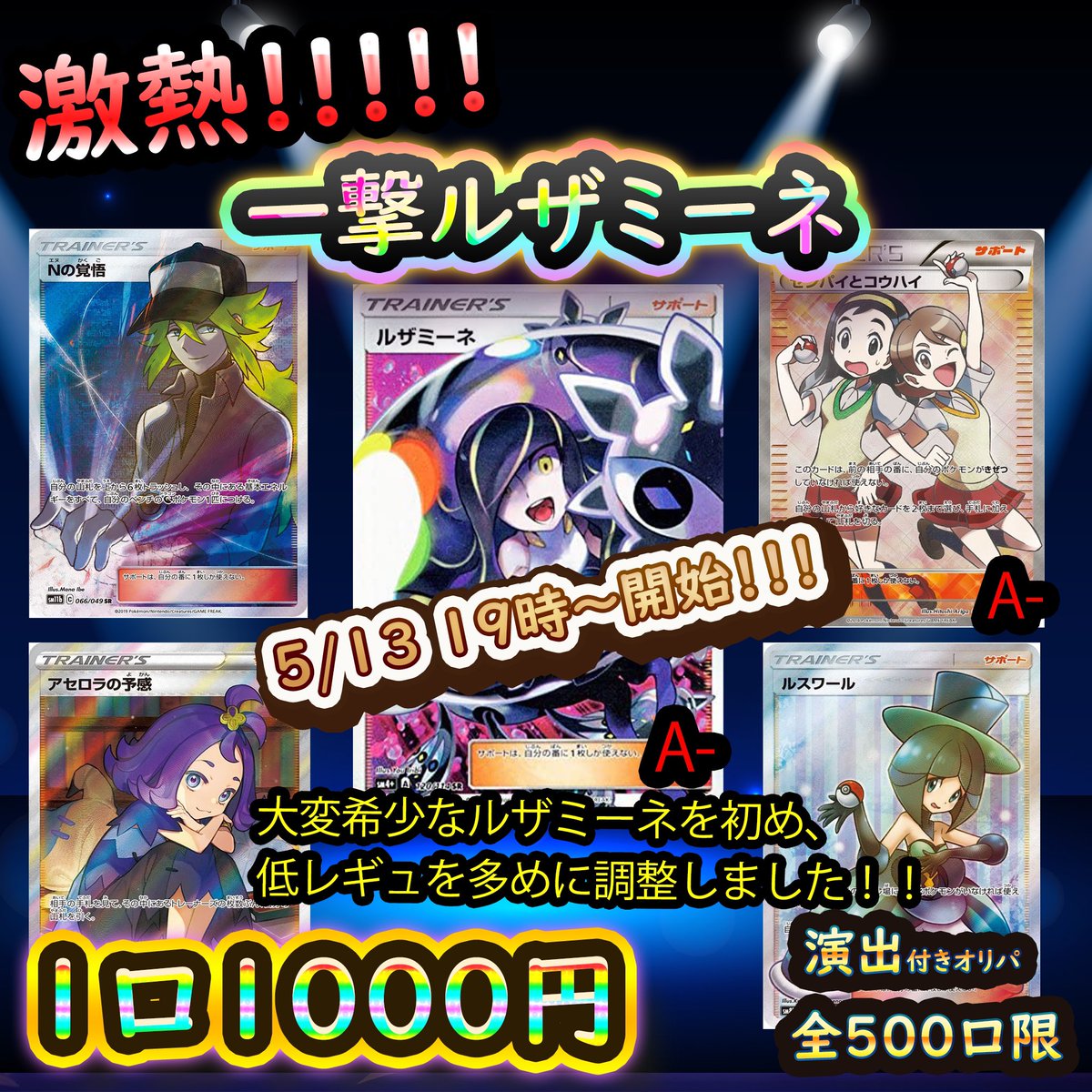 明日(5/13)19時より、1000円オリパ「一撃ルザミーネ」が始まります!!!🔥