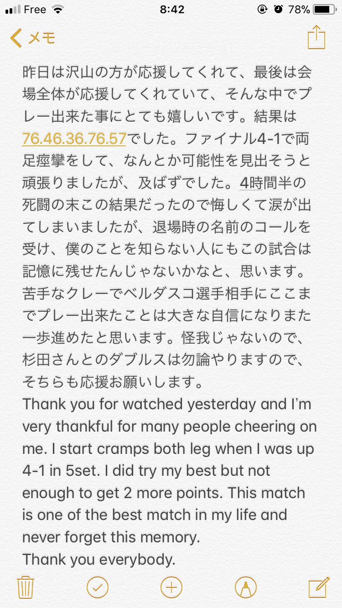 耐え抜いた試合でした。沢山の応援ありがとうございました。楽天で皆さんに会えるのを楽しみにしています。 twitter.com/atptour/status…