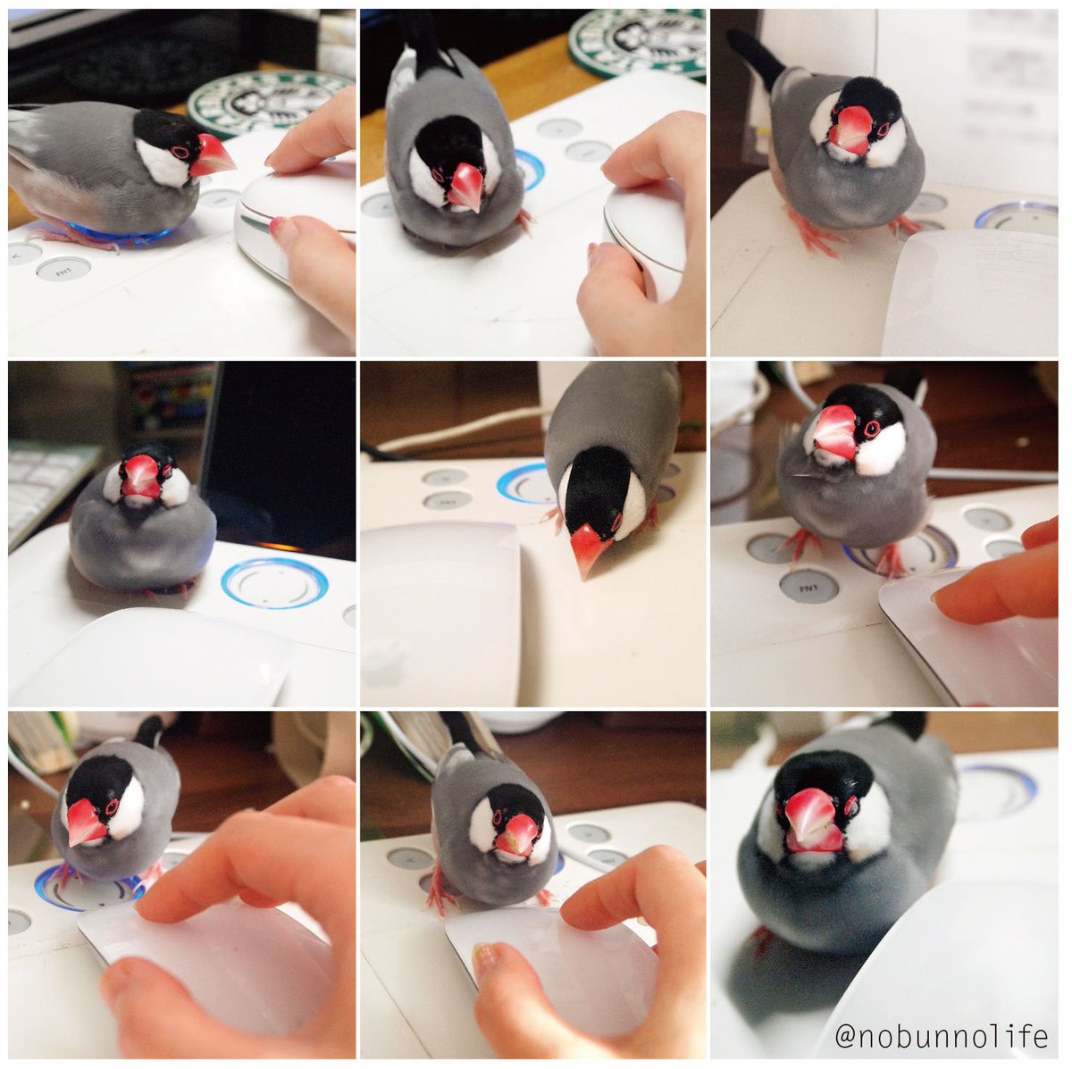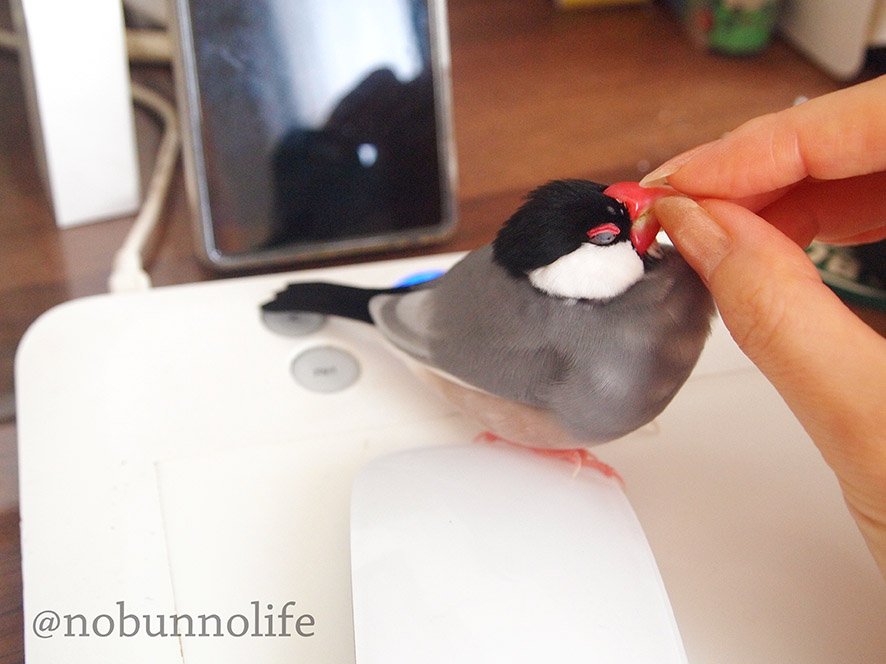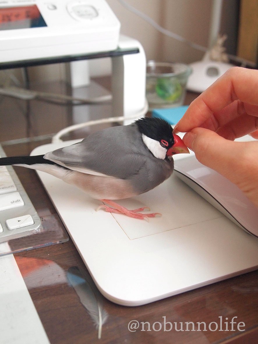 文鳥、手とマウスの間にそっと割り込む能力が高すぎて いつも気づかないうちにこうなってる…