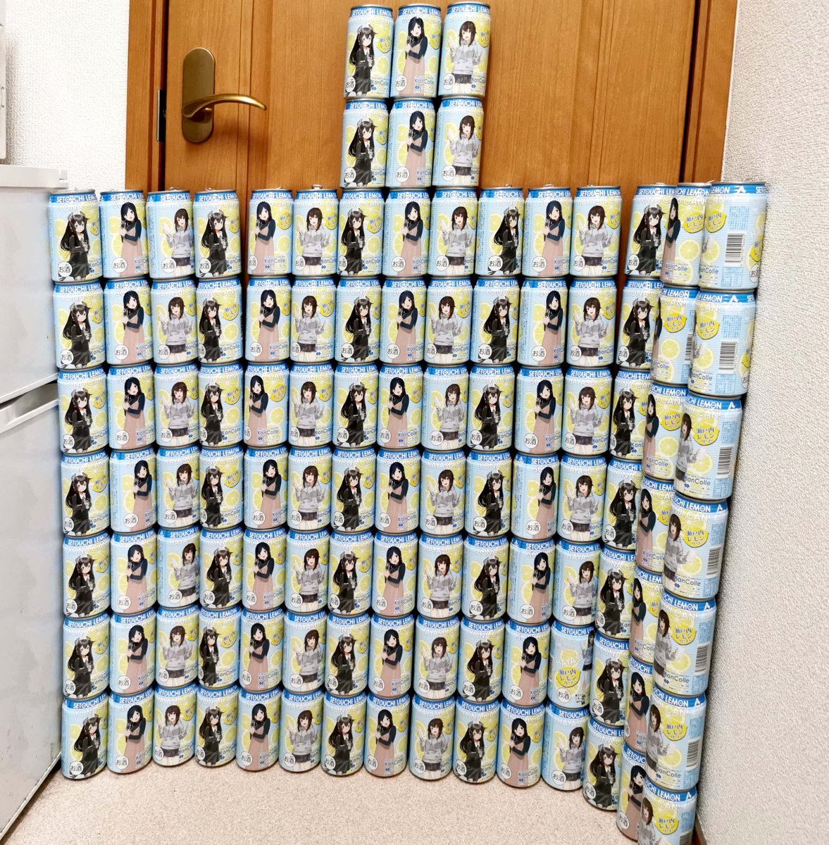 由良の進水日の2月15日にちなんで、由良みかんサワーを215本積み上げてみました