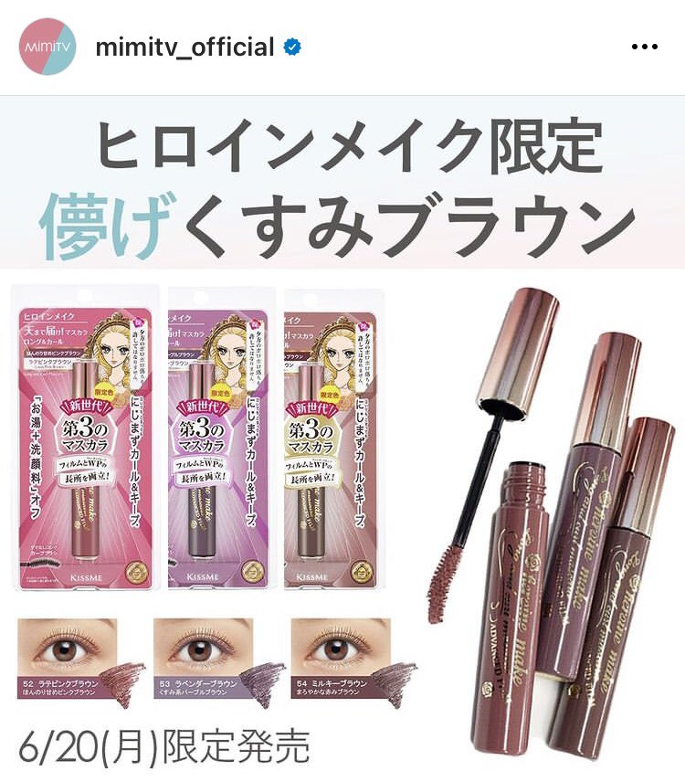 ヒロインメイクの限定儚げくすみブラウン、この絶妙なカラーはずるい!!絶対可愛いまつ毛になるに決まってる!!編集部人気は53 ラベンダーブラウンですが、ストーリー投票では52 ラテピンクブラウンが人気でした💁♀️