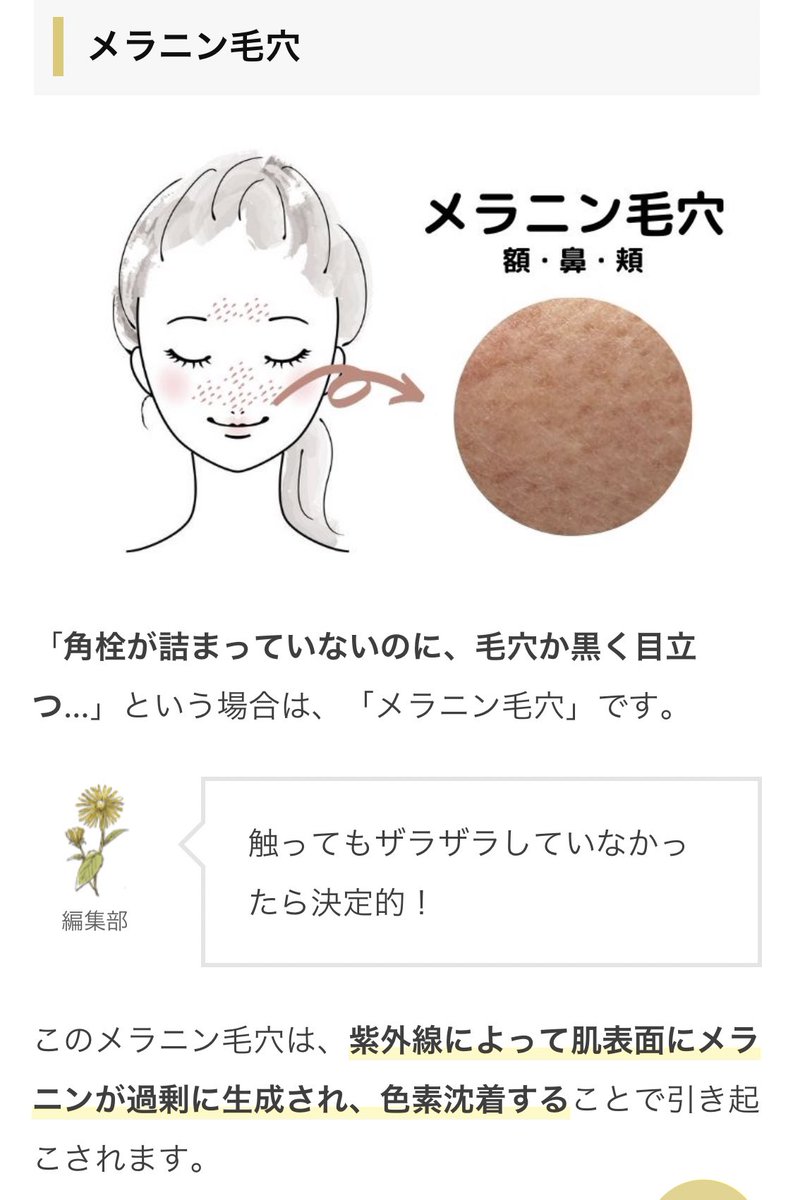私がお客様から毛穴のお悩みを相談された時は視覚だけではなくて「お肌に触れますね」と許可を得て、優しく指の腹を使ってお顔を触っていきます。ツブツブ、ザラザラだと「角栓の詰まり」、チクチクだと「産毛」、何も触れなかったりツルツルだと「メラニン毛穴」簡単な判断材料として使えるのでぜひ。