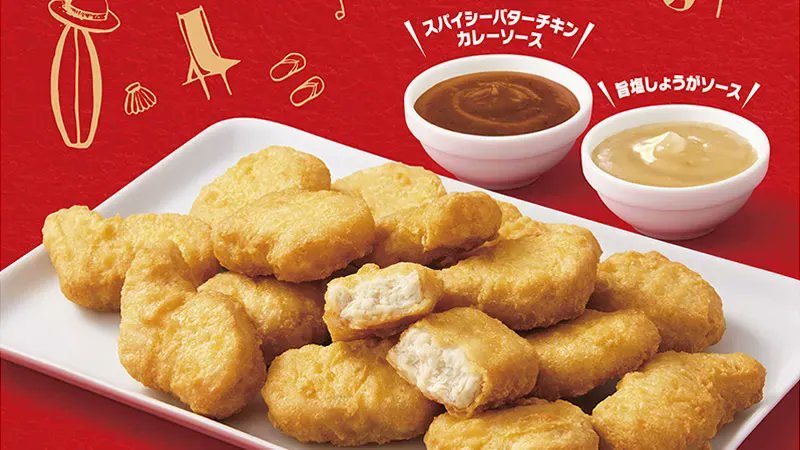 本日7/20(水)-8/30(火)マクドナルド「チキンマックナゲット 15ピース」590円→390円に。期間限定の「スパイシーバターチキンカレーソース」 「旨塩しょうがソース」も選べます→event-checker.info/mcnuggets/