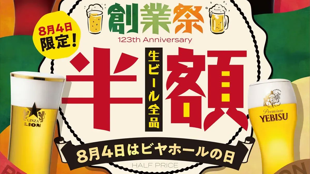 本日8/4(木)はビヤホールの日。全国のサッポロライオンチェーン(銀座ライオン、ヱビスバーなど)で、終日生ビール全品半額→event-checker.info/ginzalion/