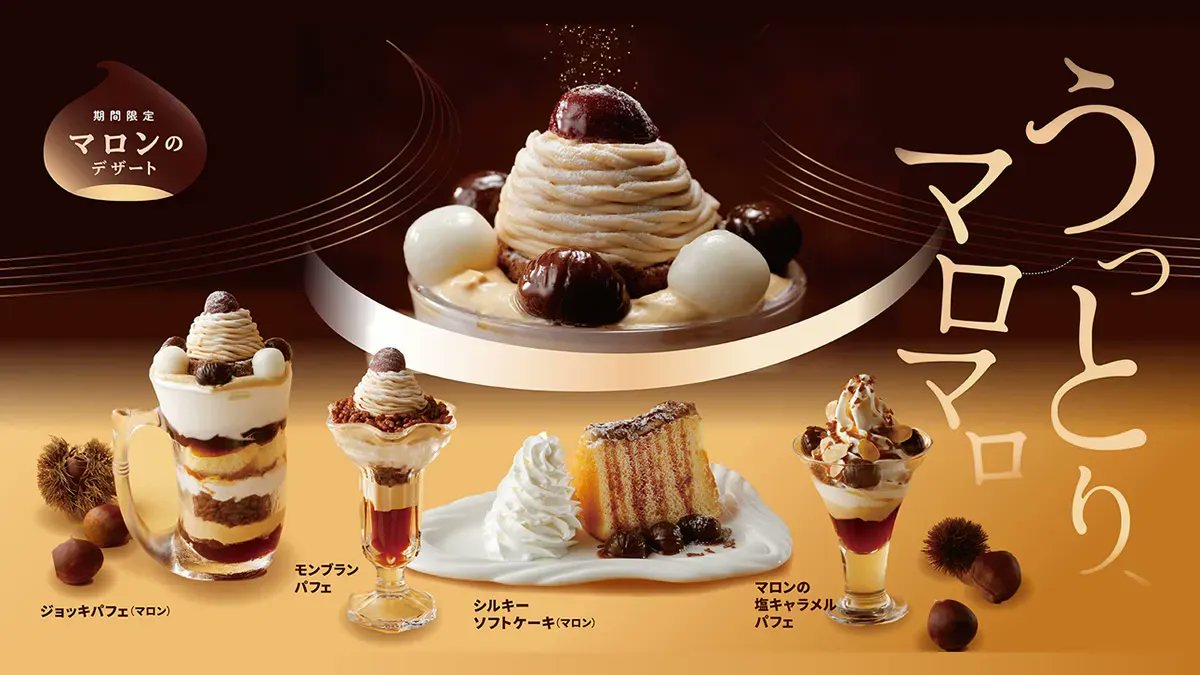 9/7(水)からファミレスのロイヤルホストでスイーツフェア「マロンデザート~渋皮栗とほうじ茶~」開催。ブリュレパフェ・モンブランパフェ・シフォンケーキなど秋を表現したデザート4品が登場。11月下旬まで→event-checker.info/royalhost-camp…