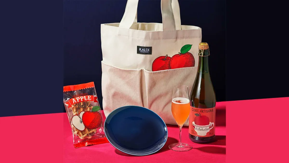 9/9(金)カルディコーヒーに「りんごバッグ」登場。トートバッグにシードル、美濃焼のお皿、りんごワッフルを詰め合わせた数量限定セット。実店舗・オンラインストアともに一人1個まで。1,840円→event-checker.info/kaldi-apple-ba…