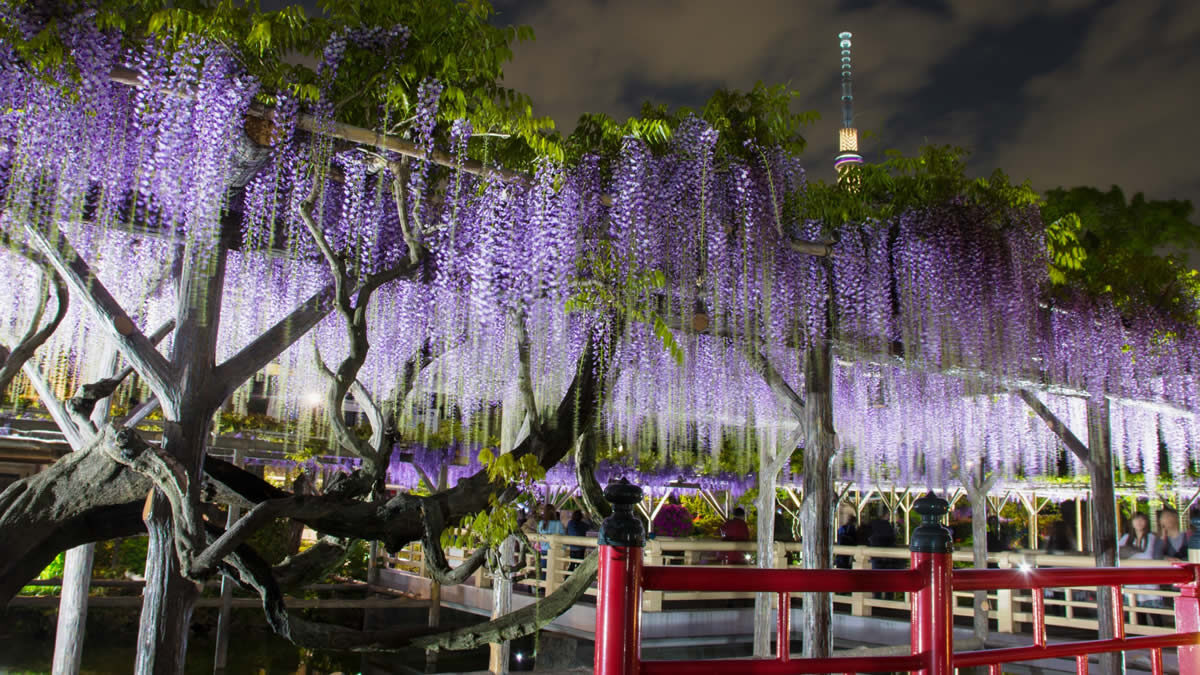 4/16(土)-5/5(木祝)東京・江東区の亀戸天神で「藤まつり」開催。ライトアップされた夜の藤も幻想的です→event-checker.info/fuji-kameido