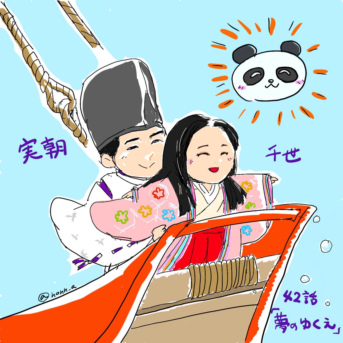 #鎌倉殿の13人 #鎌倉絵 #殿絵 「海が怖いか?」 「とんでもない、千世はいつでも、 鎌倉殿のおそばにいとうございます」 朱い大きなあの船で、 一緒に宋の国まで行けたら、、、 鶴岡八幡宮のイベントでの、 おそろいコーデの実朝・千世 夫婦が とても素敵すぎて 二人に夢中です✨