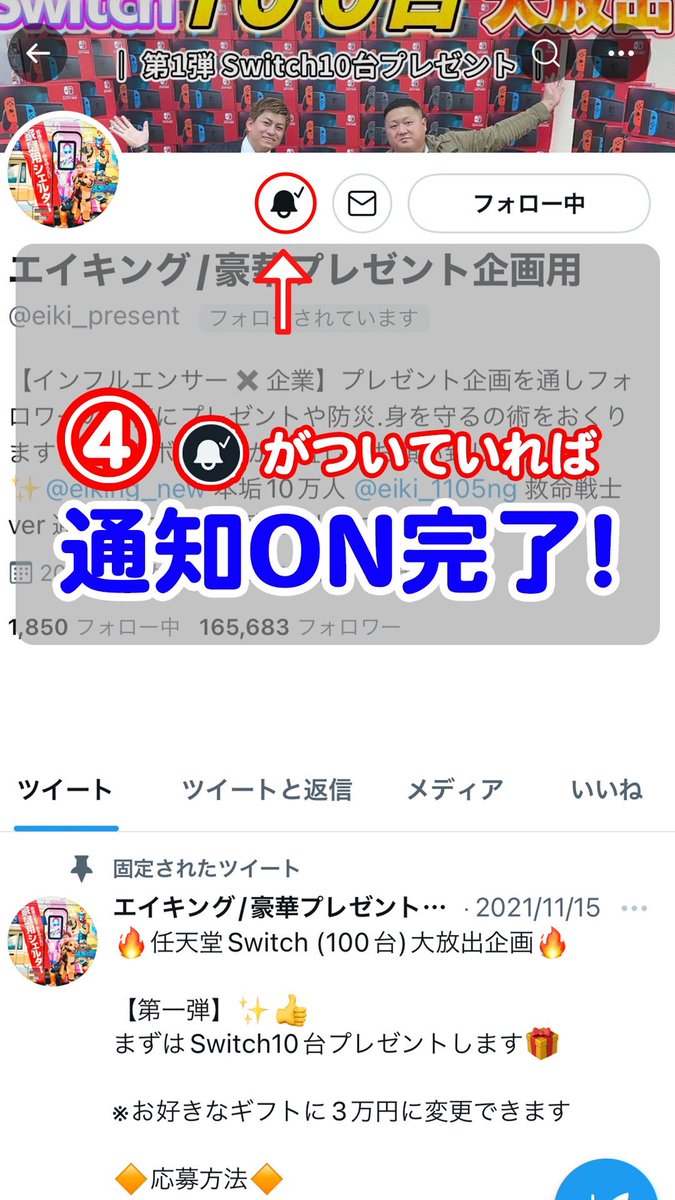 固定ツイートで開催中のSwitch100台プレゼント第二弾の