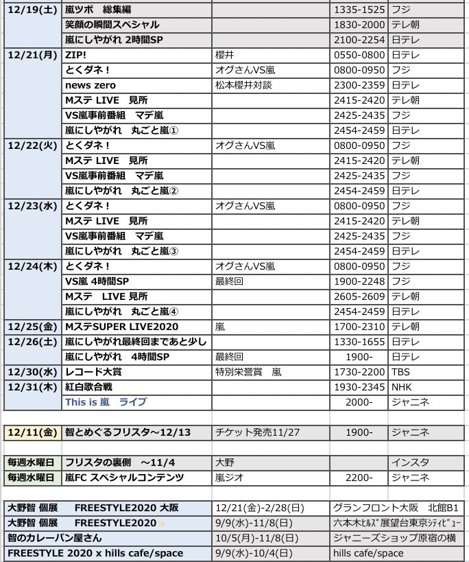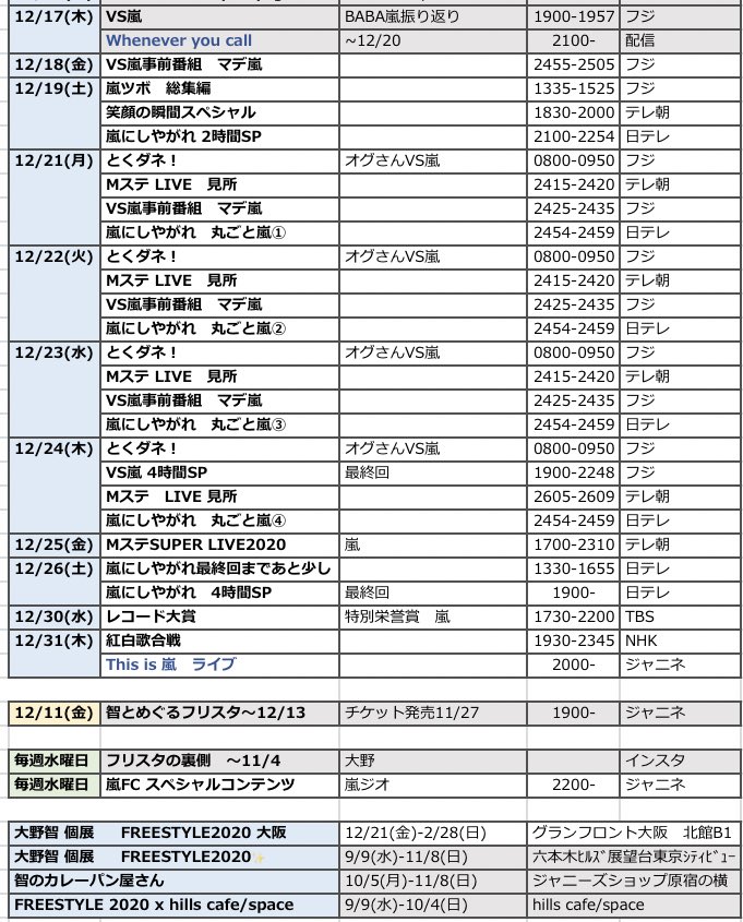 11/27~12/8 FNS見どころ(表参照)