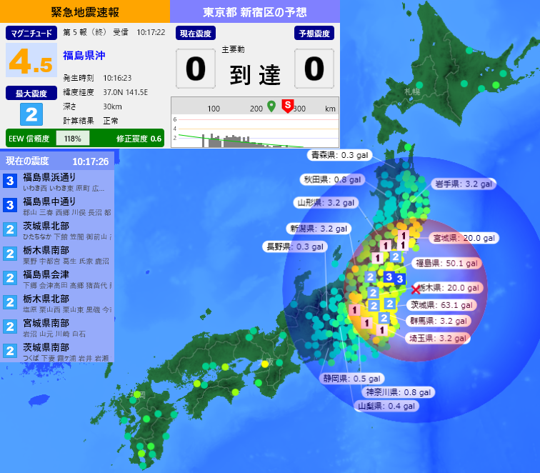 [緊急地震速報] 10:17:28現在 第5報(終) 予報 発生時刻:10:16:23 震央情報:福島県沖 震源情報:37.0N 141.5E 30km 地震規模:M4.5 最大震度:2 予想震度:0.5 猶予時間:主要動 到達
