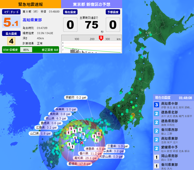 [緊急地震速報] 01:48:10現在 第8報(終) 予報 発生時刻:01:47:09 震央情報:高知県東部 震源情報:33.5N 134.0E 40km 地震規模:M5.1 最大震度:4 予想震度:0.0 猶予時間:あと74秒