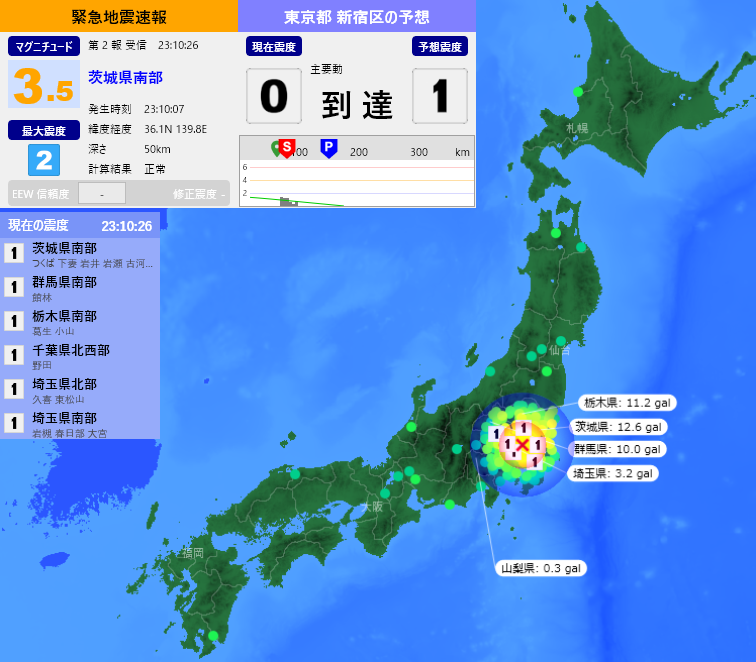 [緊急地震速報] 23:10:28現在 第2報 予報 発生時刻:23:10:07 震央情報:茨城県南部 震源情報:36.1N 139.8E 50km 地震規模:M3.5 最大震度:2 予想震度:1.0 猶予時間:主要動 到達