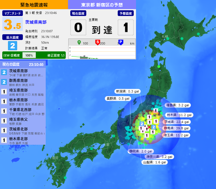 [緊急地震速報] 23:10:48現在 第3報 予報 発生時刻:23:10:07 震央情報:茨城県南部 震源情報:36.1N 139.8E 50km 地震規模:M3.5 最大震度:2 予想震度:1.0 猶予時間:主要動 到達
