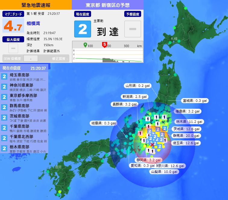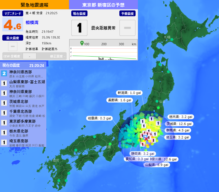 [緊急地震速報] 21:20:14現在 第1報 予報 発生時刻:21:19:48 震央情報:神奈川県東部 震源情報:35.3N 139.3E 140km 地震規模:M4.2 最大震度:2 予想震度:1.4 猶予時間:あと9秒