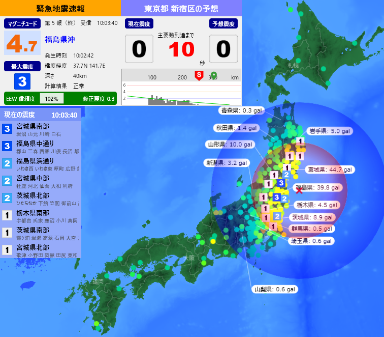 [緊急地震速報] 10:03:42現在 第5報(終) 予報 発生時刻:10:02:42 震央情報:福島県沖 震源情報:37.7N 141.7E 40km 地震規模:M4.7 最大震度:3 予想震度:0.3 猶予時間:あと10秒