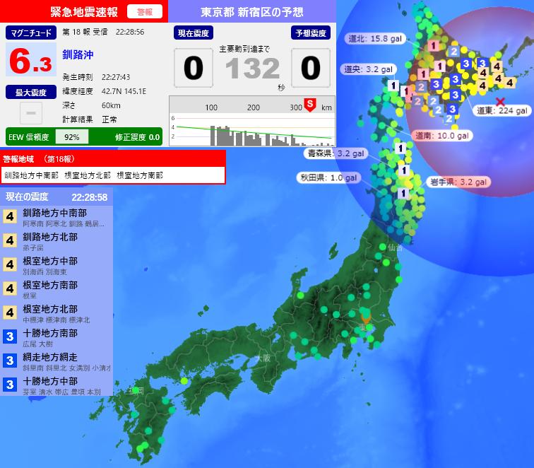 [緊急地震速報] 22:29:00現在 第18報 警報 発生時刻:22:27:43 震央情報:釧路沖 震源情報:42.7N 145.1E 60km 地震規模:M6.3 最大震度: 予想震度:0.0 猶予時間:あと132秒