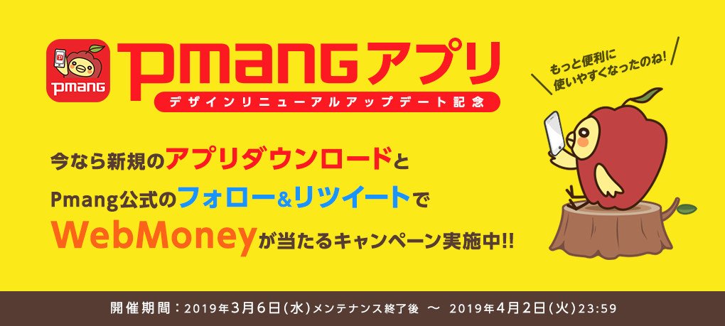 今なら@Pmang_officialをフォロー&このツイートをRTで【WebMoney1万円分】を抽選で3名様にプレゼントするキャンペーンを実施中!2019/4/2まで