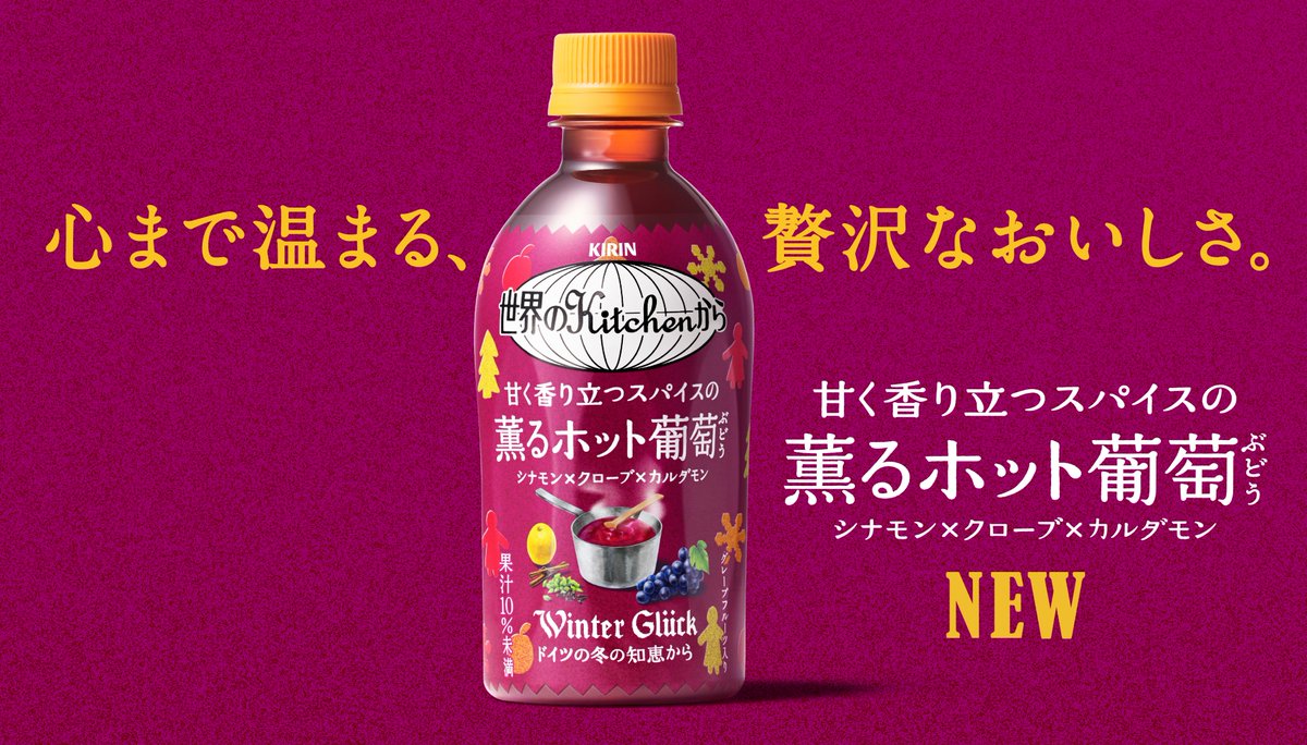 ついに、全国発売です。「世界のKitchenから 甘く香り立つスパイスの薫るホット葡萄」は、寒い冬を楽しむドイツの知恵から。スパイスと葡萄のコクで心も体も温まりますよ。goo.gl/nMc0vT