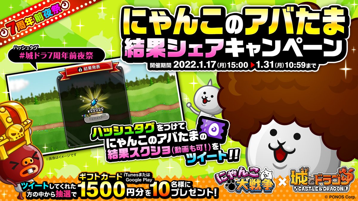 ②にゃんこのアバたまに挑戦し、結果のスクリーンショットor動画と「#城ドラ7周年前夜祭」をつけて投稿!