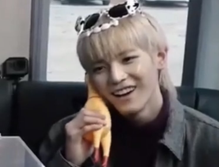 taeyong taking a picture of himself holding onto the hotdog while pretending his calling someone… 😂