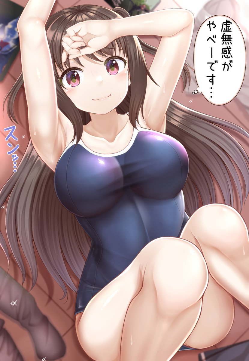 暑すぎるので勢いに任せて家の中でスク水に着替えたものの急激に虚しくなってきた女の子の絵です