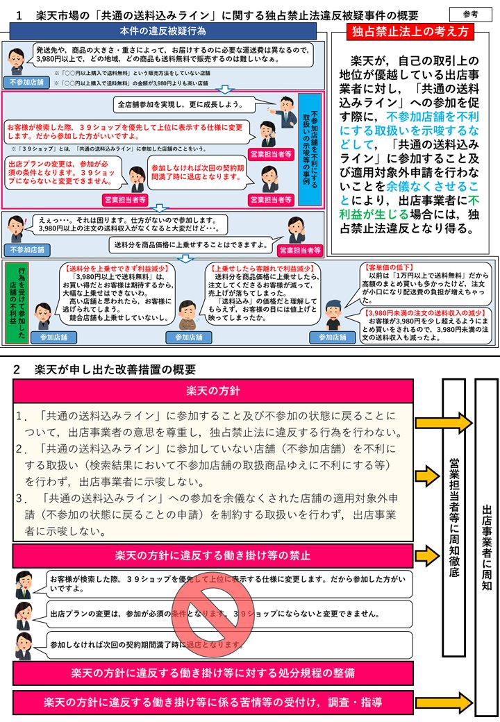 楽天グループ㈱が楽天市場の出店事業者に対し"共通の送料込みライン"(39ショップ)への参加を余儀なくさせ,出店事業者が不利益を被っていた疑いについて,今後改善措置の実施を確認した上で調査を終了することとしました。
