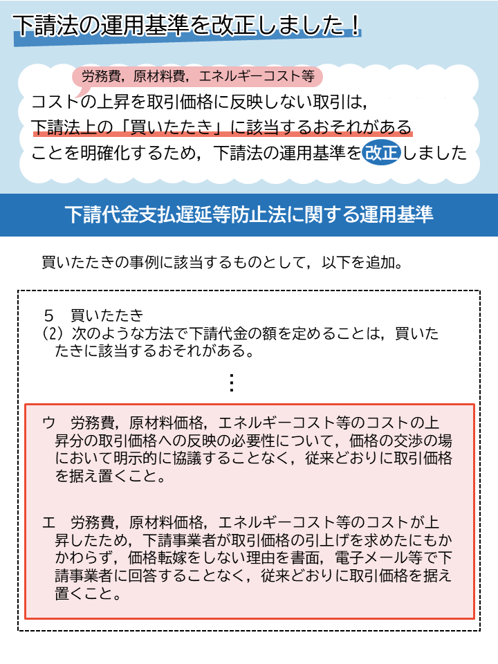 労務費,原材料費,エネルギーコストの上昇を取引価格に反映しない取引は,下請法上の禁止行為である「買いたたき」に該当するおそれがあります。