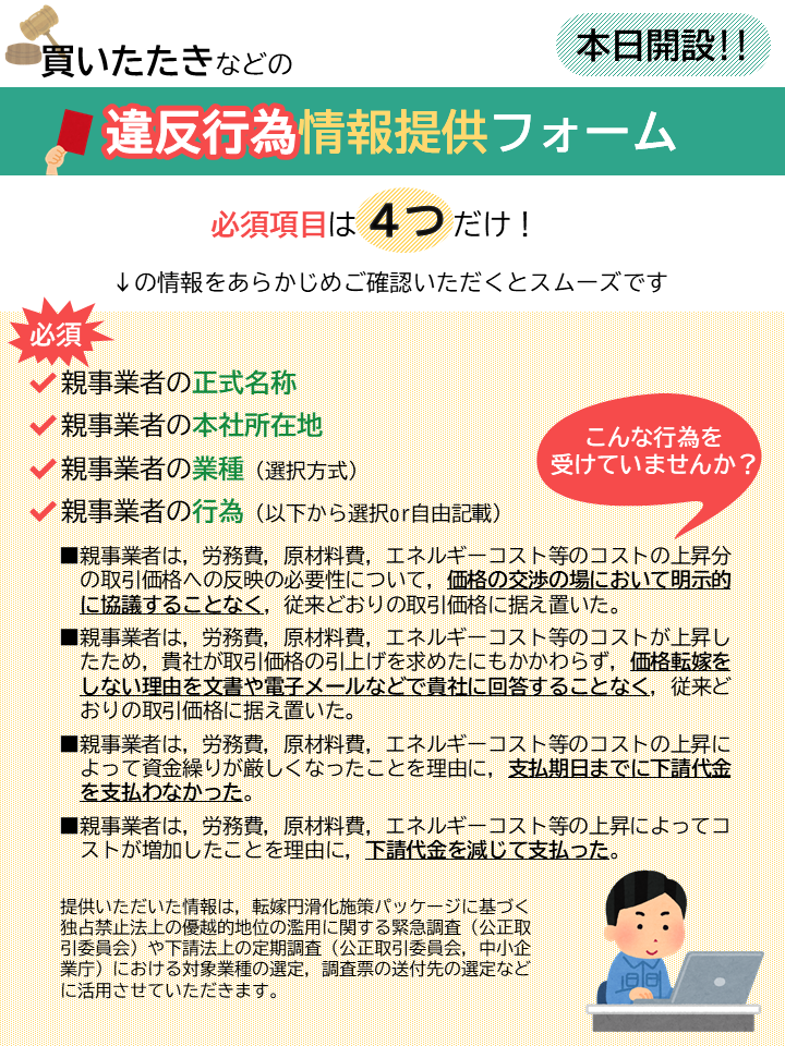 下請事業者が匿名で,下請法上の禁止行為である「#買いたたき」などの行為が疑われる親事業者に関する情報を提供できるフォームを設置しました。