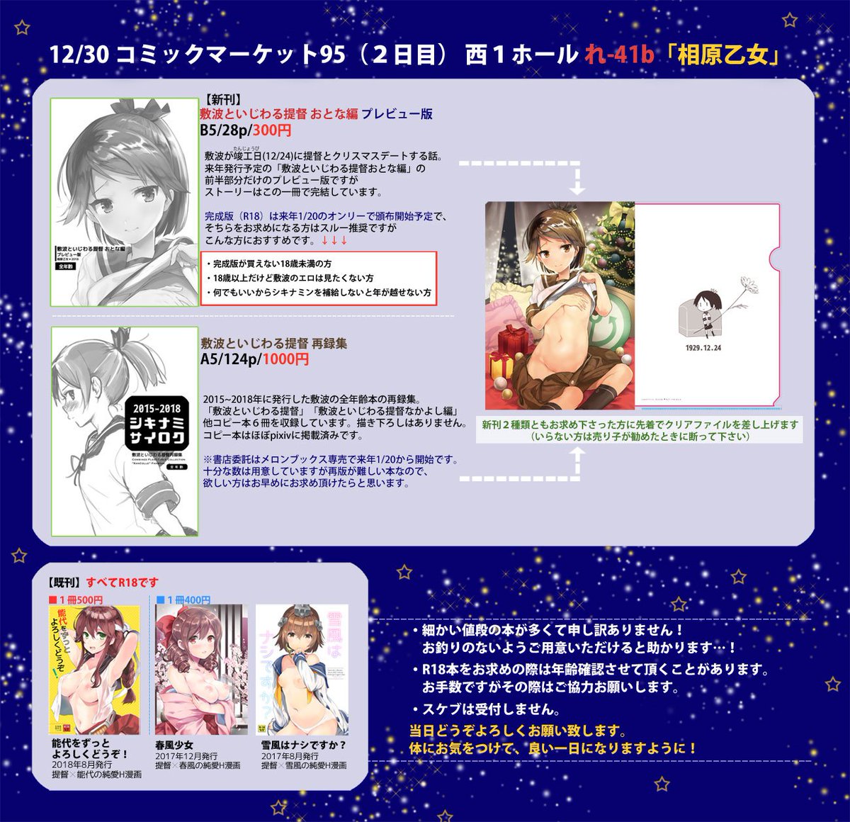 冬コミ新刊の一冊目は敷波の全年齢本の再録集です。「敷波といじわる提督」「敷波といじわる提督なかよし編」他コピー本6冊の124p1000円です。委託はメロンブックス専売でお願いする予定です。 本文の6割が鉛筆書きかつpixiv公開済みなので、紙でとっときたい方だけお求めくださいね…!