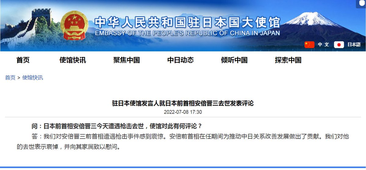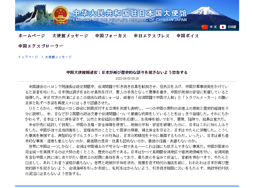 中国大使館報道官:日本が再び歴史的な誤りを犯さないよう忠告するjp.china-embassy.gov.cn/jpn/dsgxx/2022…