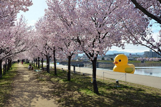 千数百本の桜と黄色いアヒルの共演が今から楽しみです