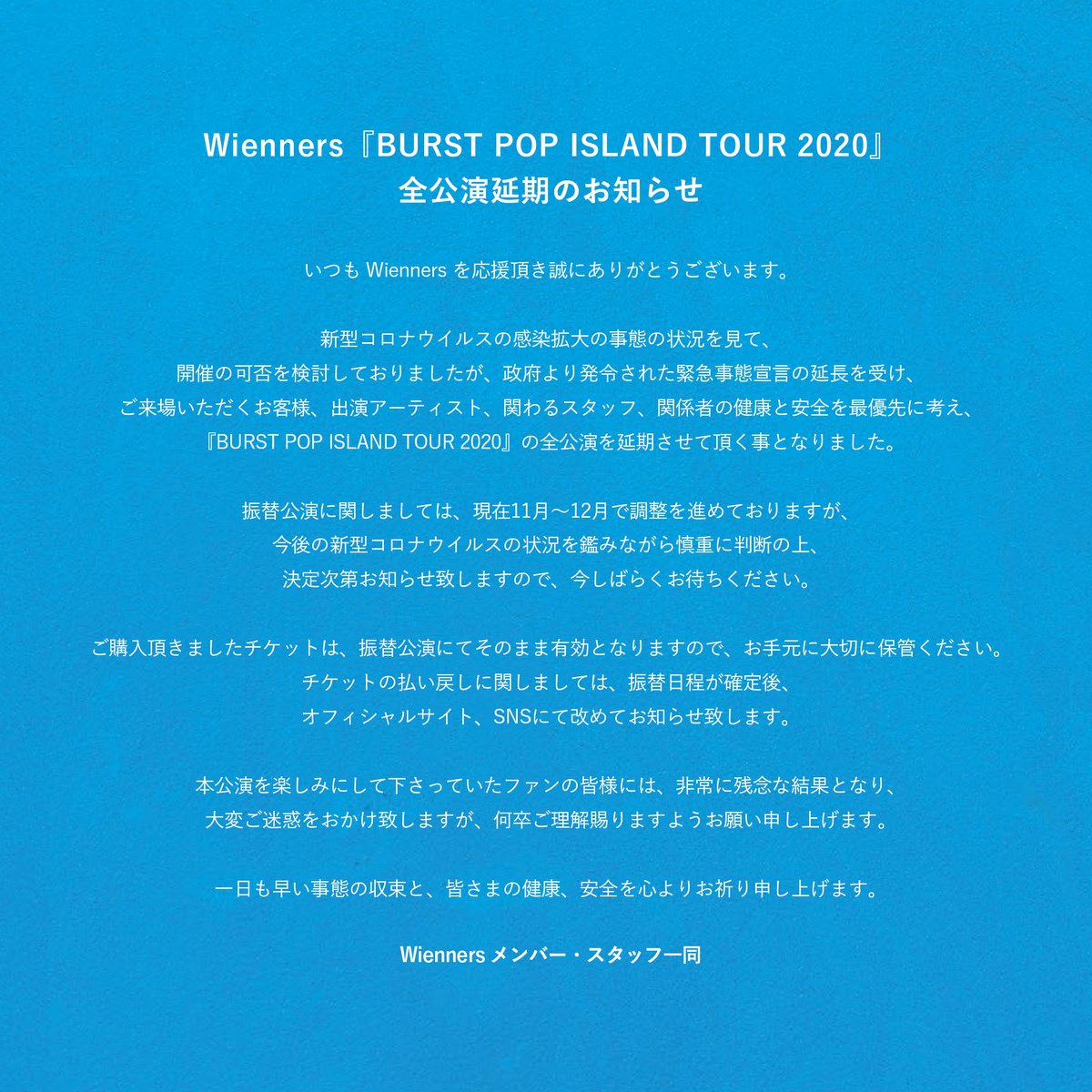 この4人で活動してから今日で5年が経ちました。いつも支えてくださる全国のファンの皆様、ライブハウス、イベンター、メディア、スタッフの皆様に心より感謝申し上げます。これからも #Wienners を宜しくお願いします!