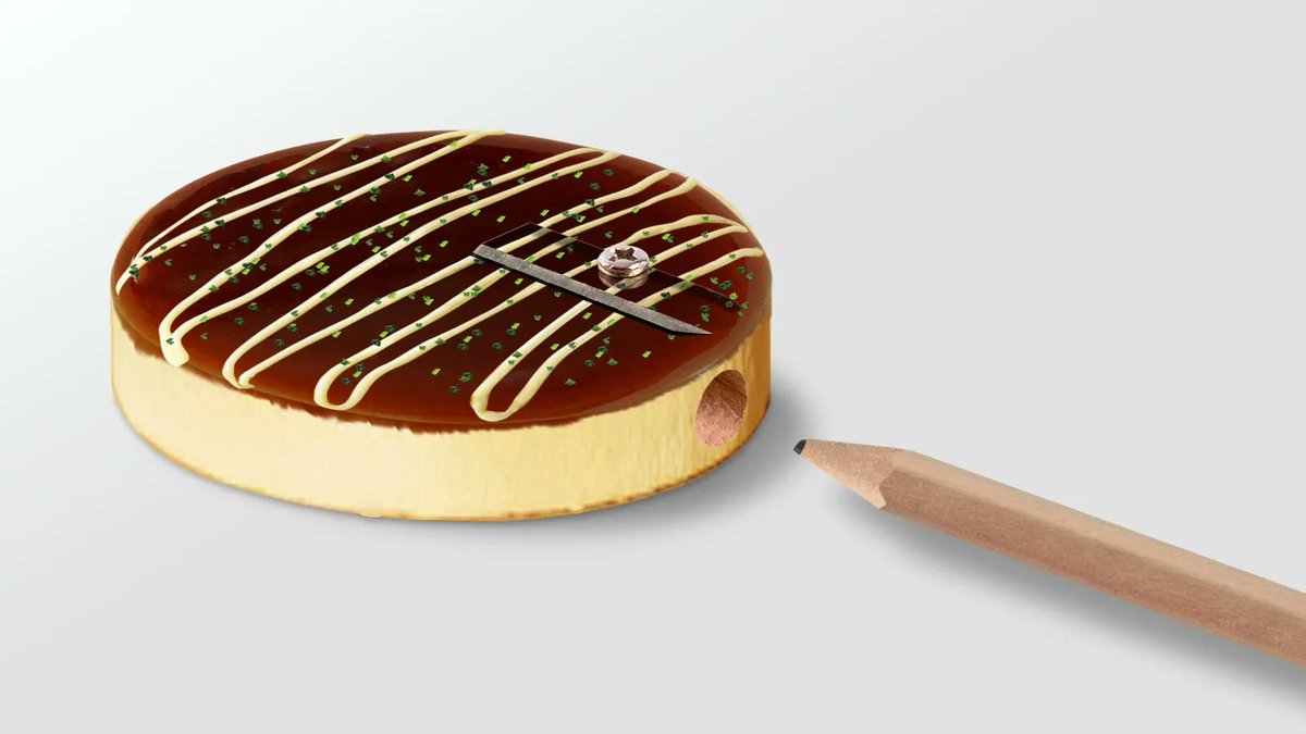お好み焼きのような形状をした鉛筆削り。削りカスがお好み焼きの上にまぶされた鰹節のように出てくるアイデアです。