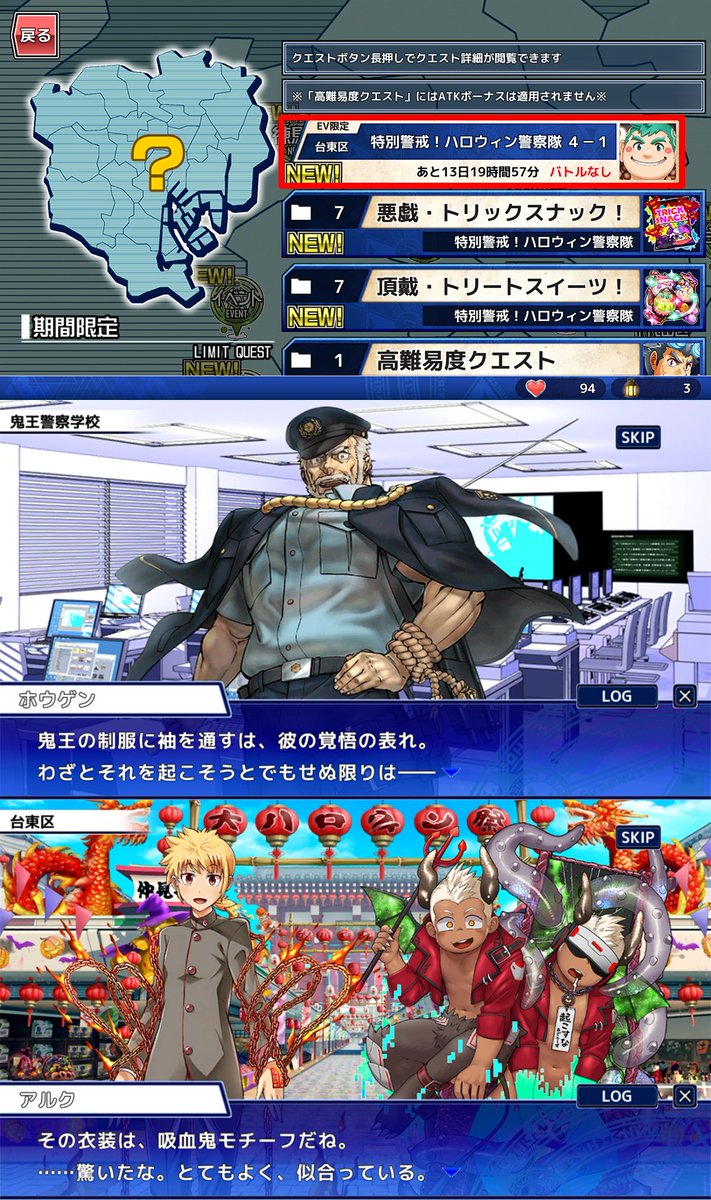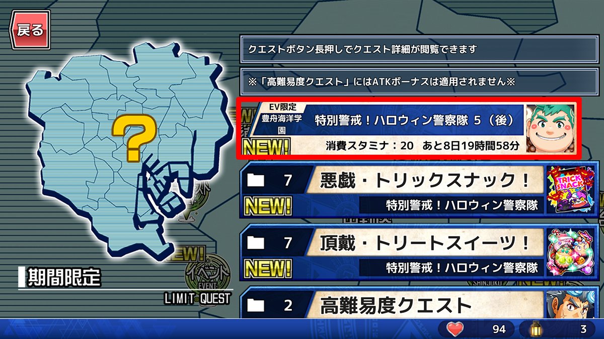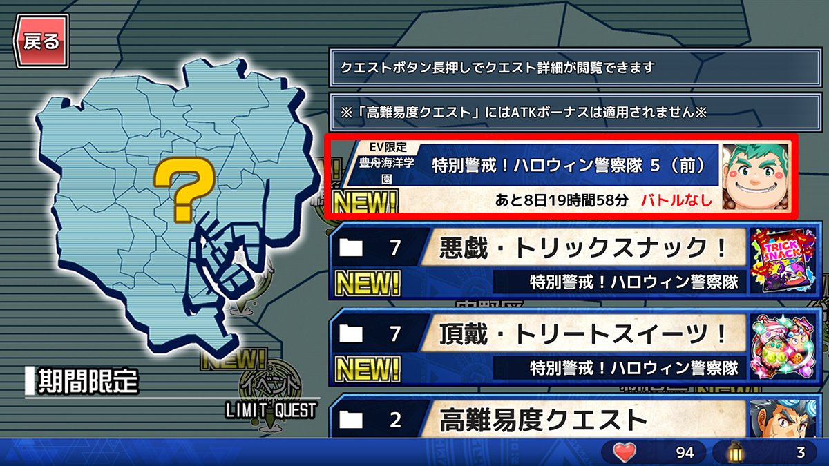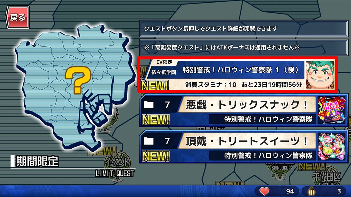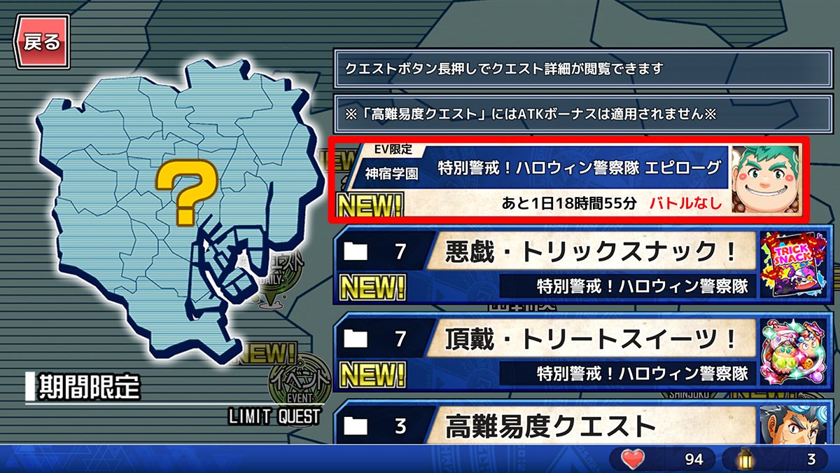 東京放課後サモナーズ、期間限定イベント「特別警戒!ハロウィン警察隊(ポリス)」エピローグをクリアすると特殊クエストが解放されます。該当するキャラ(★3.4.5のどれか)を所持していると、イベントバナーorイベント地域から、見る事ができます。