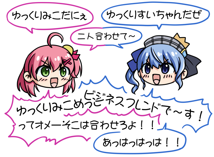 絵描きなら誰しもが憧れるあのセリフをイラスト化。すいちゃんがみこちを脅しているようで、よく見るとシルエットはハート型と言う飛んでもないてぇてぇイラスト。