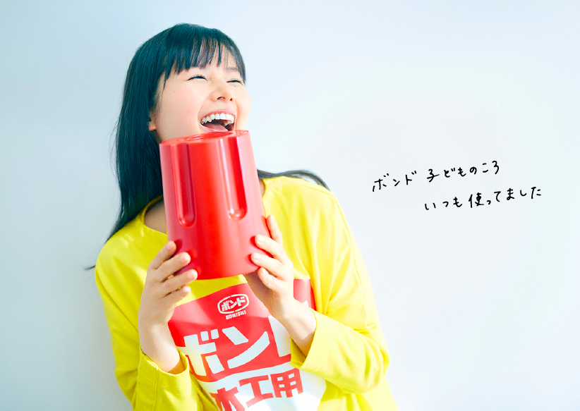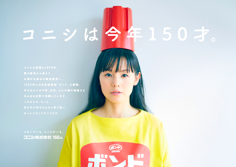 今年で創立150年を迎えるボンドでおなじみの「コニシ」が名前つながりで小西真奈美さんにボンドのコスプレさせている。