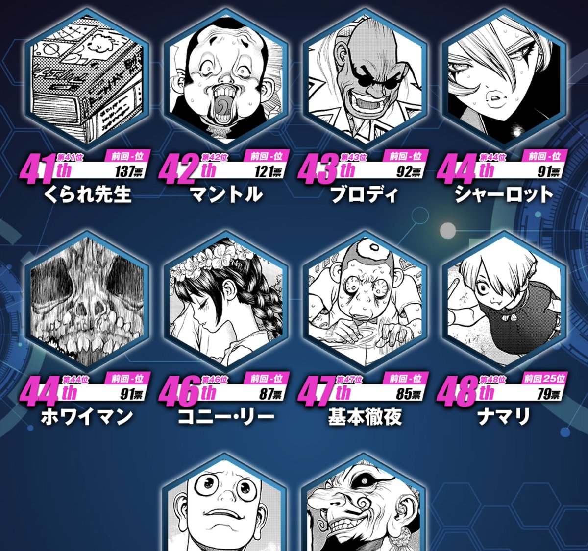 Dr.STONEのキャラ人気投票で何故か41位に入ってました 当然作中の絵はないので ちらっと出たアリエナイ理科の絵にw shonenjump.com/j/vote_drstone/