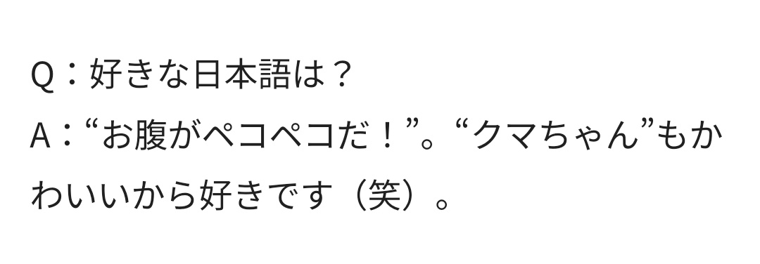 💛: お腹がペコペコだ!(onaka ga pekopeko da! / "I'm starving!") I also like "クマちゃん" (kuma-chan / "bear-chan") because it's cute.