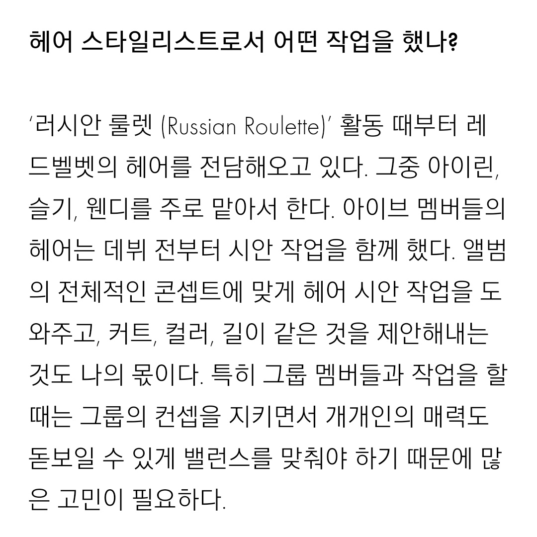 Hairstylist Yoon Seoha mentioned #SEULGI in an interview. She started working with Red Velvet during Russian Roulette, mainly for Irene, Seulgi, and Wendy. Part of her job is proposing hairstyles (cut, color, length) that best suit the album concepts.