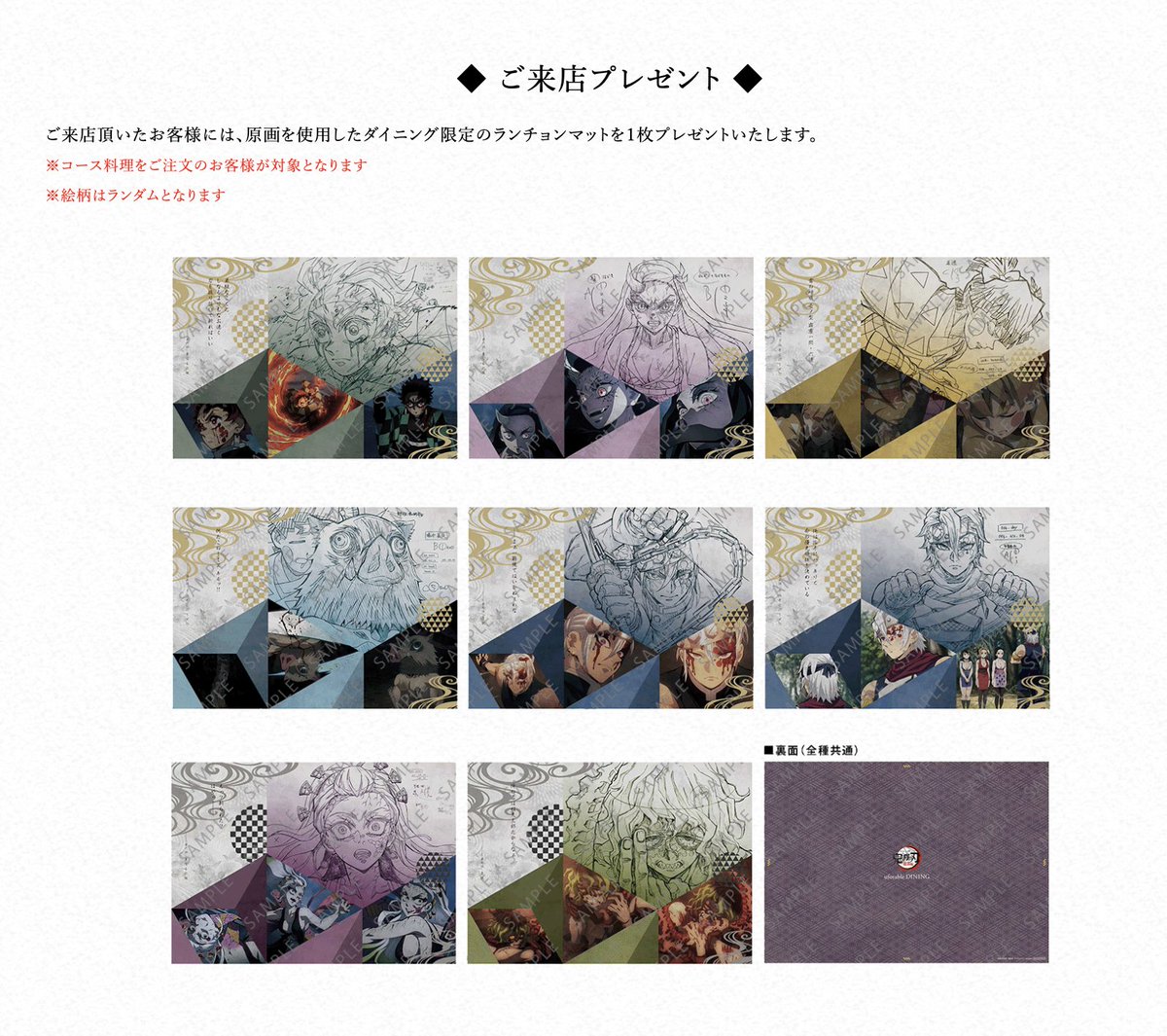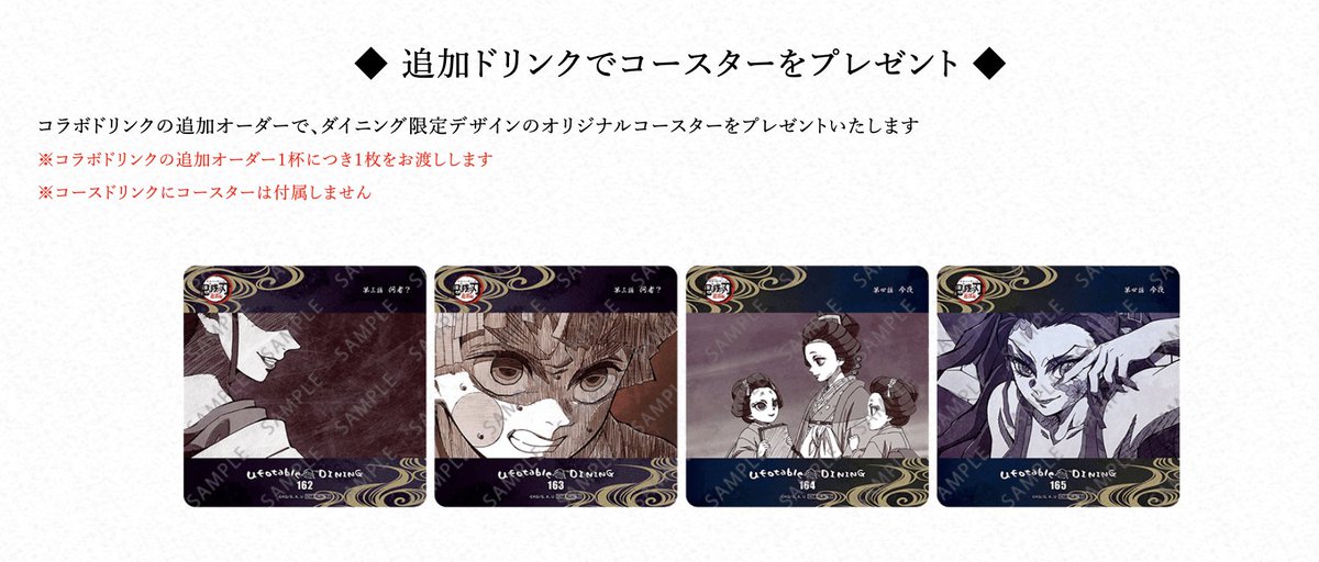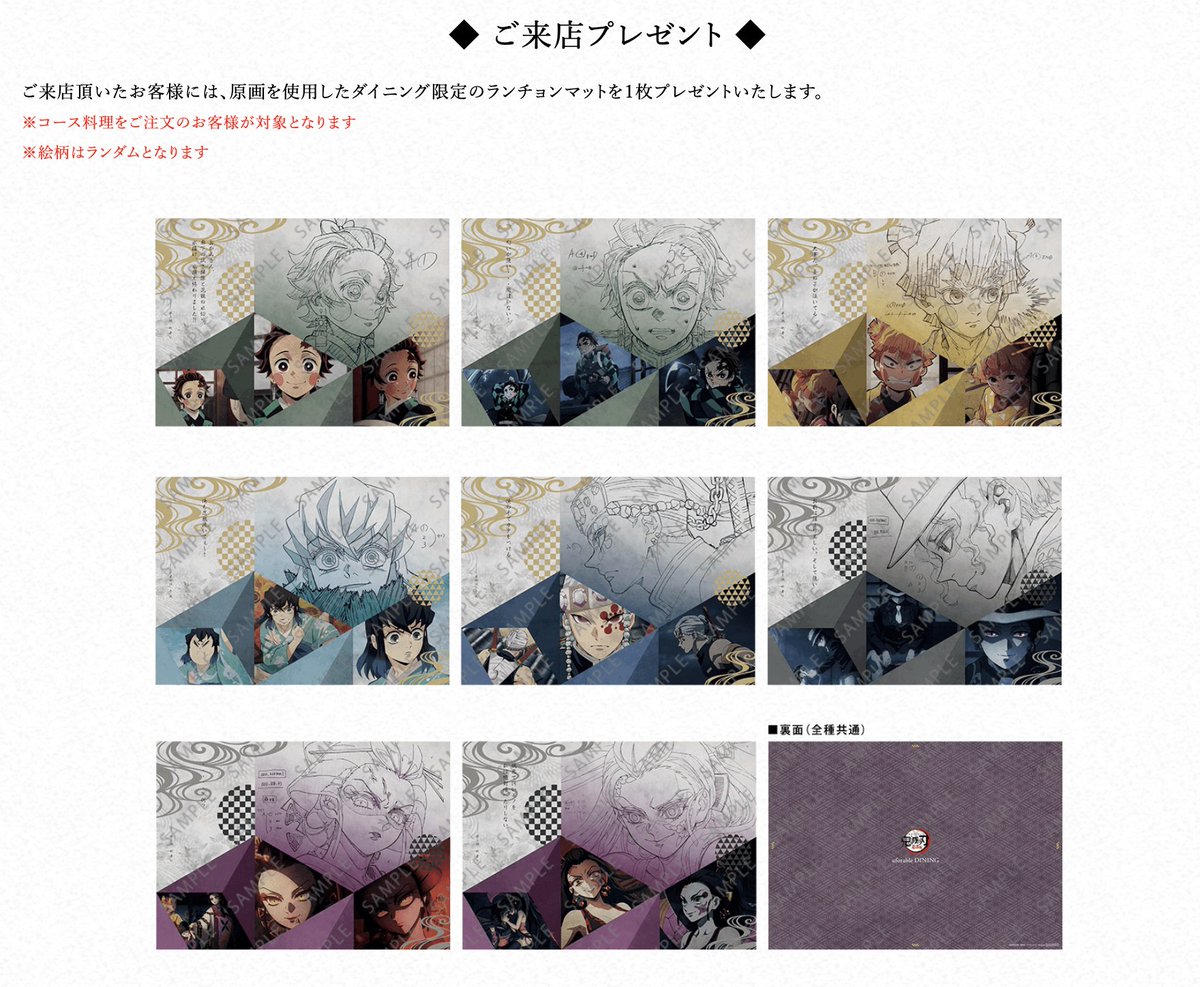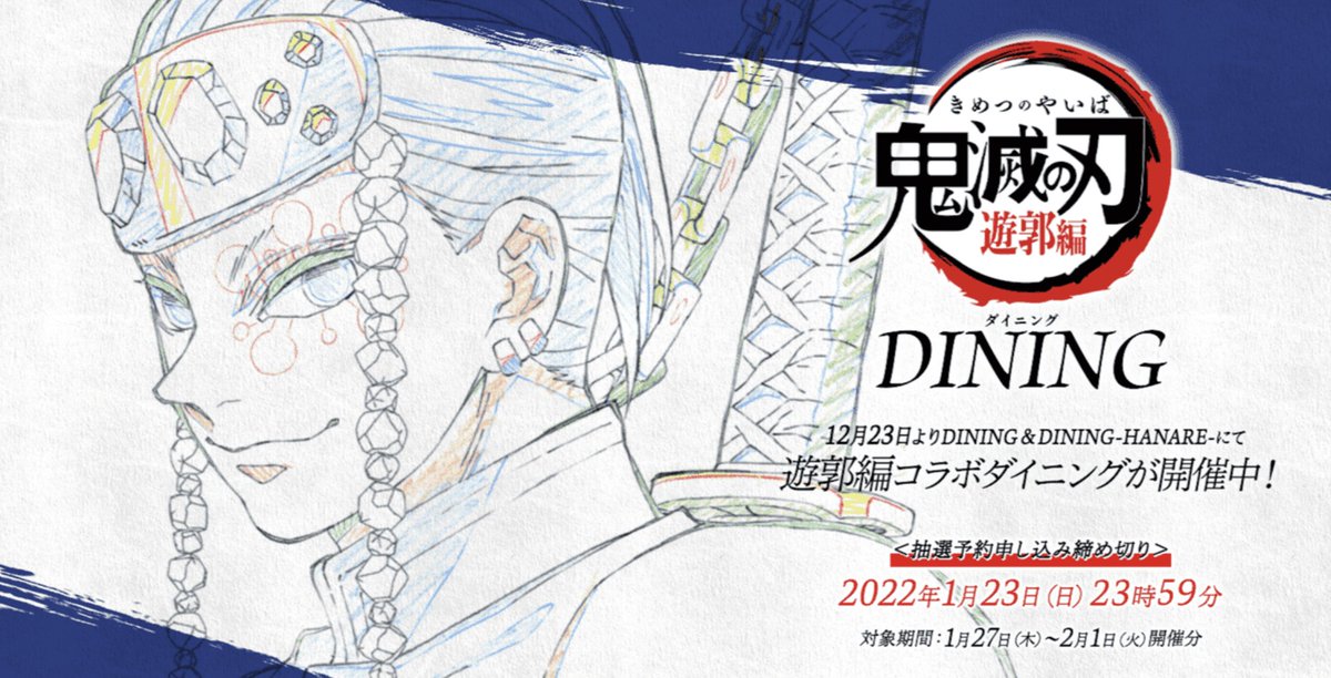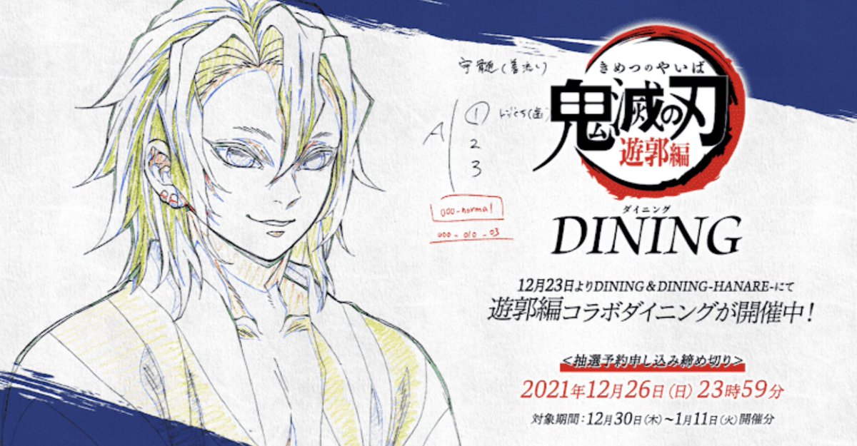 現在開催中のテレビアニメ「鬼滅の刃」遊郭編コラボダイニング第2期の新規抽選予約受け付けを只今より開始いたします。注意事項にお目通し頂きご応募のほどよろしくおねがいします。